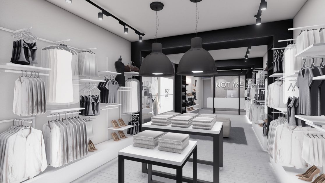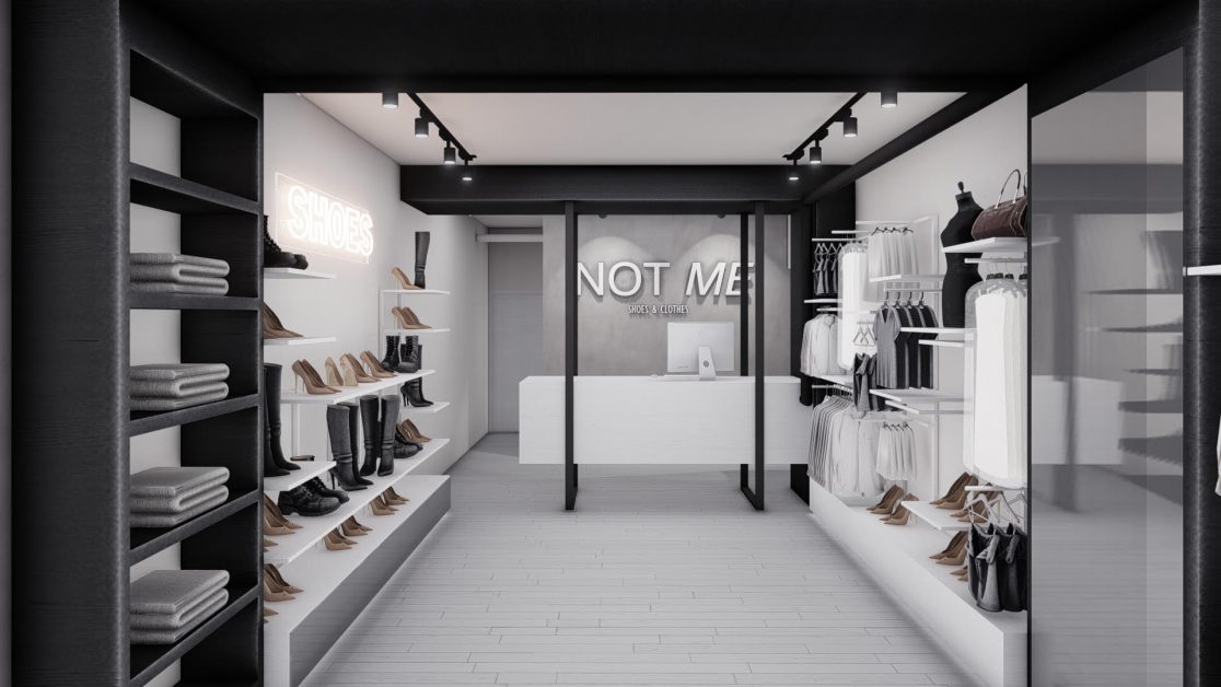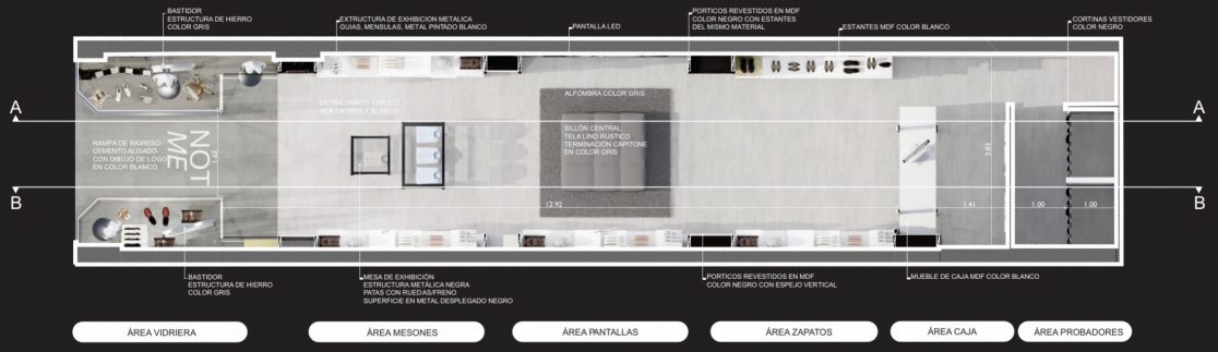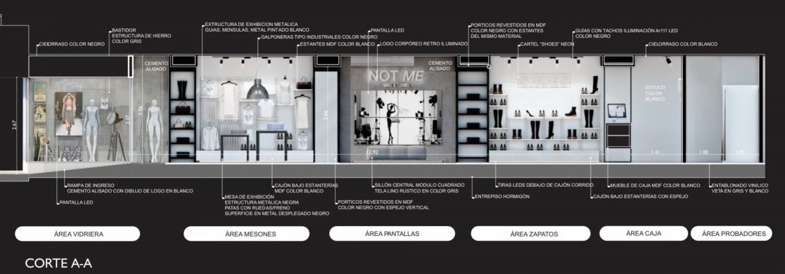 Ambas vidrieras contaran con sector de exhibición para maniquíes, estructura metálica tipo marco, para colocar ropa, objetos de decoración, luces decorativas, imágenes, calzado, etc. Desde el techo se colocaran algunas cadenas con ganchos, para poder colocar en ellas objetos o ropa, como así también bancos , estructuras tipo escaleras o cubos para apoyo. Letras metálicas con luces tipo retro, ploteos en paredes de frases e imágenes de ciudades , como asi también lamparas tipo escenográficas, terminan de completar la imagen industrial urbana que conceptualiza la marca.